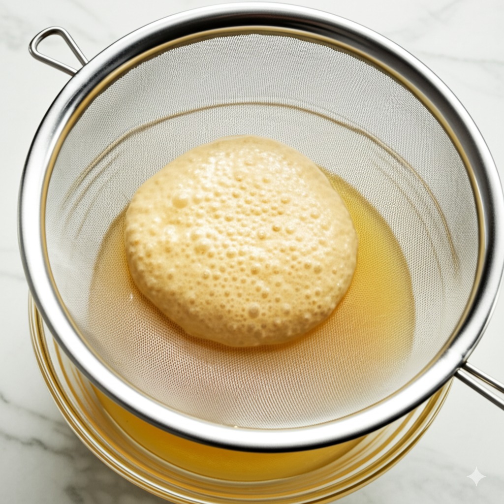 6. 간 콩물을 고운 체나 면포에 걸러 콩 찌꺼기 (비지)를 분리합니다. 체에 남은 콩 찌꺼기는 숟가락으로 눌러 최대한 짜냅니다.